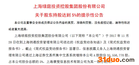 2017年11月,上海炳通投资管理有限公司(以下简称“上海炳通”)举牌上市公司绿庭投资(现名“*ST绿庭”),被市场视为顾国平的一次曲线举牌。