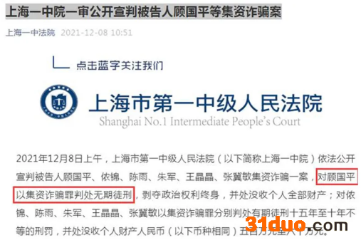 12月8日上午,上海市第一中级人民法院(以下简称“法院”)对相关案件进行了公开宣判,其中的关键人物——顾国平以集资诈骗罪被判处无期徒刑。