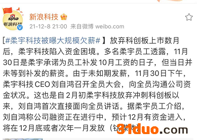 独角兽柔宇科技, 被爆出连工资都发不出来,陷入资金困境。柔宇科技在业内一直备受争议。2020年11月,柔宇科技传出搁置美国上市计划、转向科创板上市的消息,并抢在2020年的最后一天在上交所披露招股书,正式冲刺科创板。仅短短一个多月的时间后,甚至未经历至首轮问询环节,在今年2月10日晚间,上交所官网信息显示,柔宇科技科创板IPO审核状态变更为“终止”。