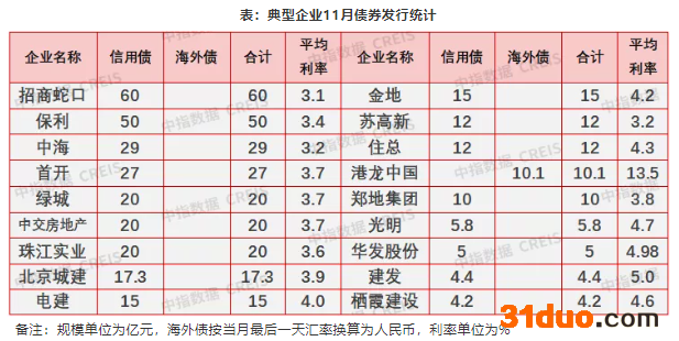 具体从典型房企债券发行来看,11月份招商蛇口融资额度最高,合计人民币60亿元,平均融资利率3.1%,其次为保利发展,合计人民币50亿元。具体来看,典型房企中信用债利率最高的为建发的4.4亿5年期中票,利率为5%;最低为招商蛇口发行的30亿短期融资券,利率为2.84%。公开发行的海外债方面,港龙中国的发行利率为13.5%。