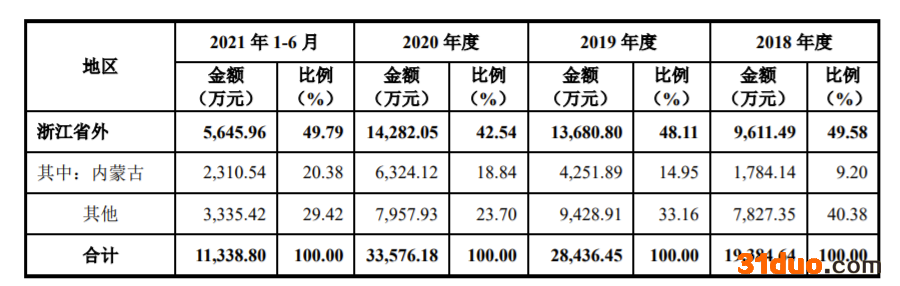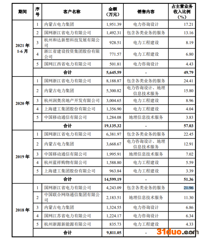 招股书显示,报告期内,内蒙古电力集团为今年上半年第一大客户,占比为17.21%,国网浙江省电力有限公司为第二大客户。而在2018年-2020年,国网浙江省电力有限公司为第一大客户,占比分别为21.96%、22.45%、24.41%。