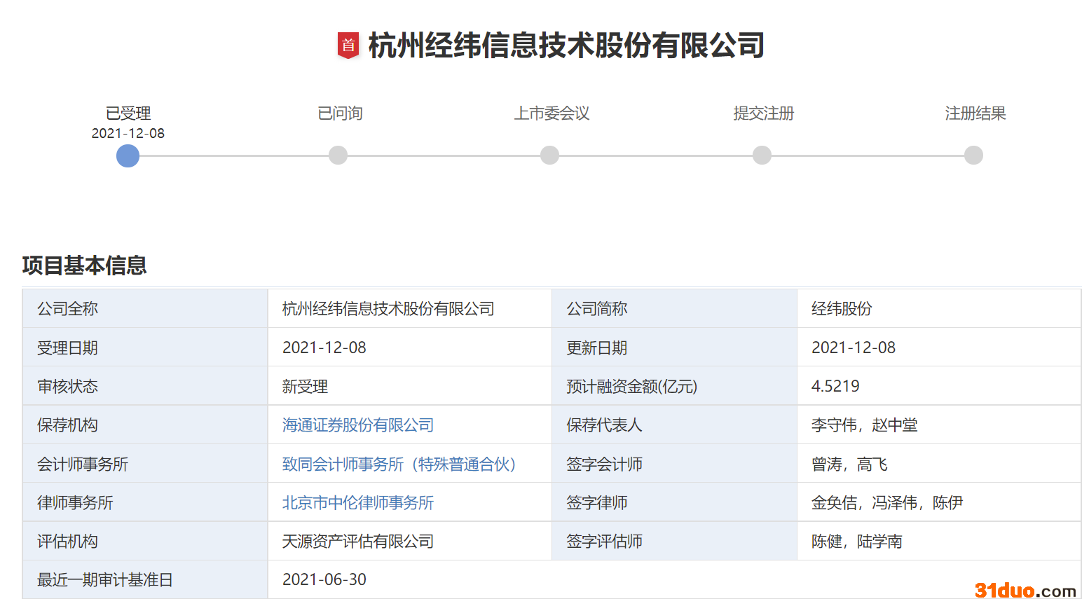 中华网财经12月9日讯 中华网财经了解到,日前,杭州经纬信息技术股份有限公司(简称“经纬股份”)创业板上市申请已获受理。拟募集资金4.5219亿元。海通证券为保荐机构。本次拟公开发行股票不超过1500万股,不低于发行后总股本的25%。本次发行全部为新股发行,原股东不公开发售股份。此前,经纬股份2016年6月24日在新三板挂牌,2017年3月31日终止挂牌。