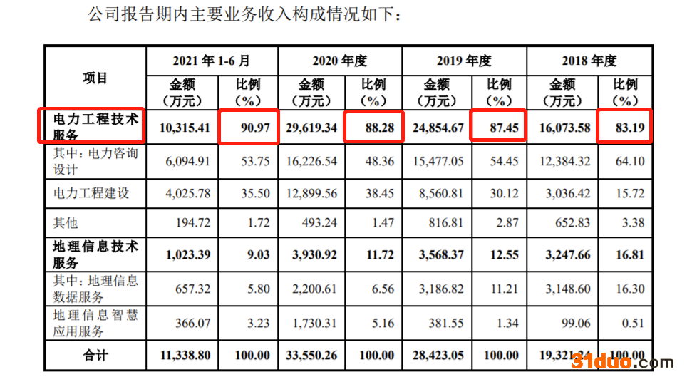 报告期内,电力工程技术服务业务收入占主营业务收入的比例分别为83.19%、87.45%、88.28%和90.97%,是主要收入和利润来源;其中电力咨询设计业务是公司业务的核心,报告期内电力咨询设计业务收入占主营业务收入的比例分别为64.10%、54.45%、48.36%和53.75%,毛利占比分别为65.66%、61.29%、59.38%和62.89%。