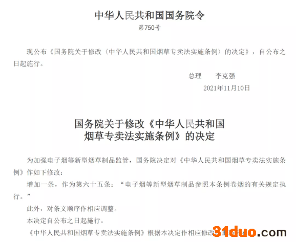 11月10日,《国务院关于修改〈中华人民共和国烟草专卖法实施条例〉的决定》正式公布施行,明确“电子烟等新型烟草制品参照本条例卷烟的有关规定执行”。
