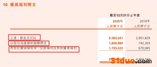 2020年年报显示,快手的“雇员福利开支”主要包括“工资、薪金及花红”、“以股份为基础的薪酬开支”和“其他社会保障成本、住房福利及其他雇员福利”三项。