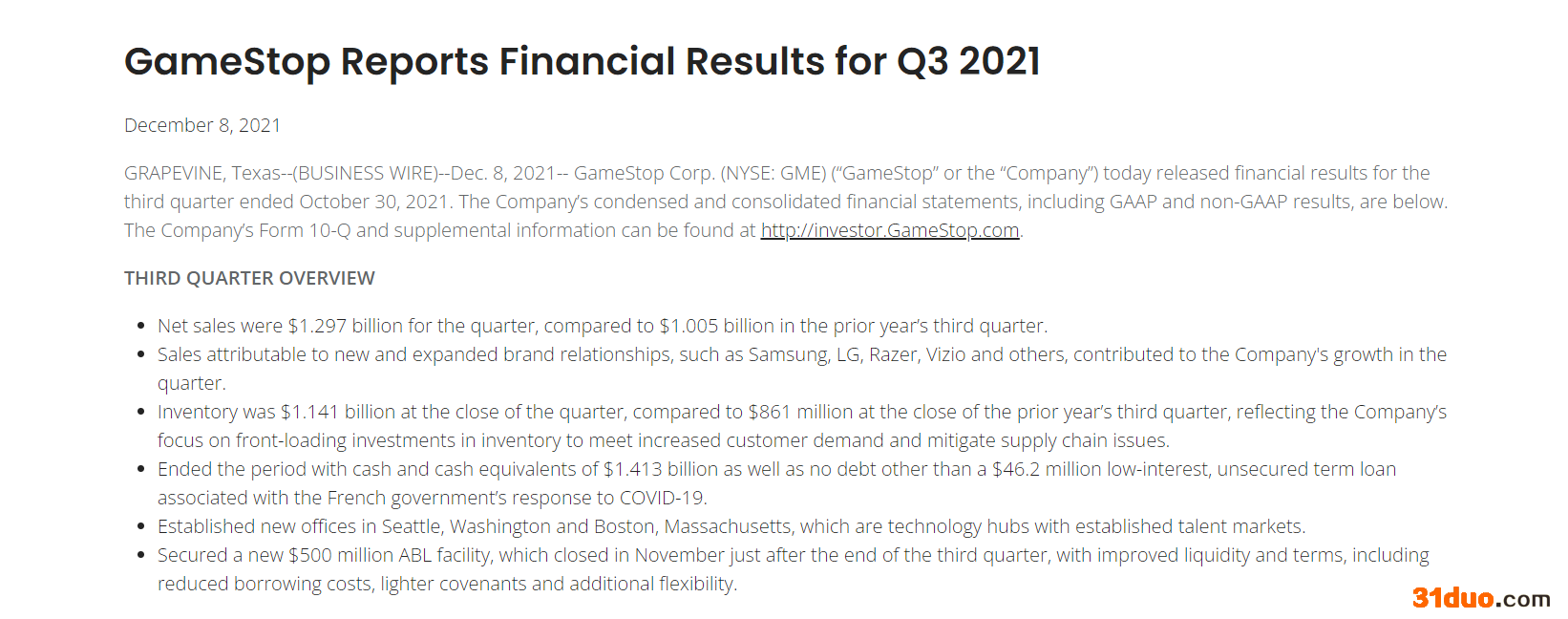 财联社(上海,编辑 史正丞)讯,当地时间周三盘后,知名散户热门股——游戏驿站(GME)公布三季报。如预期一致,在散户欢庆公司营收增长的同时,华尔街分析师对公司扩大的亏损皱起了眉头。
