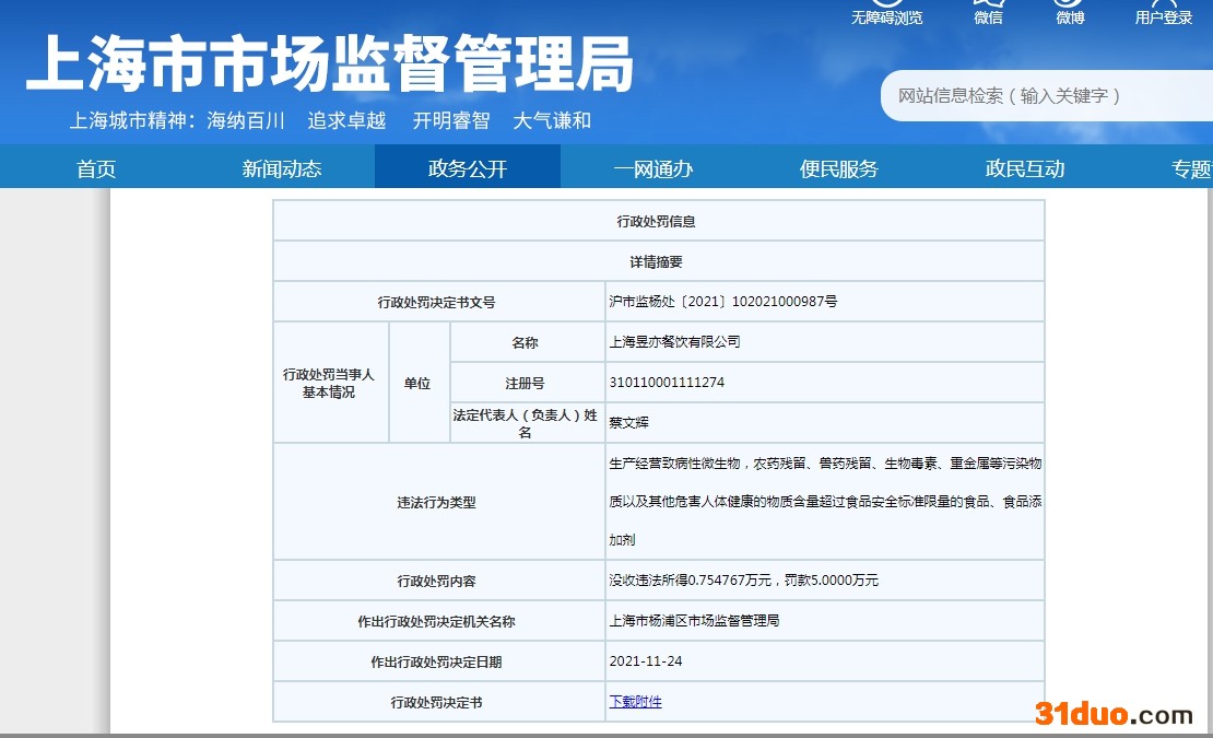 中新经纬12月9日电 上海市市场监管管理局网站公布的行政处罚信息显示,上海昱亦餐饮有限公司(胖哥俩肉蟹煲五角场店)因兽药残留超标,被罚款5万元。