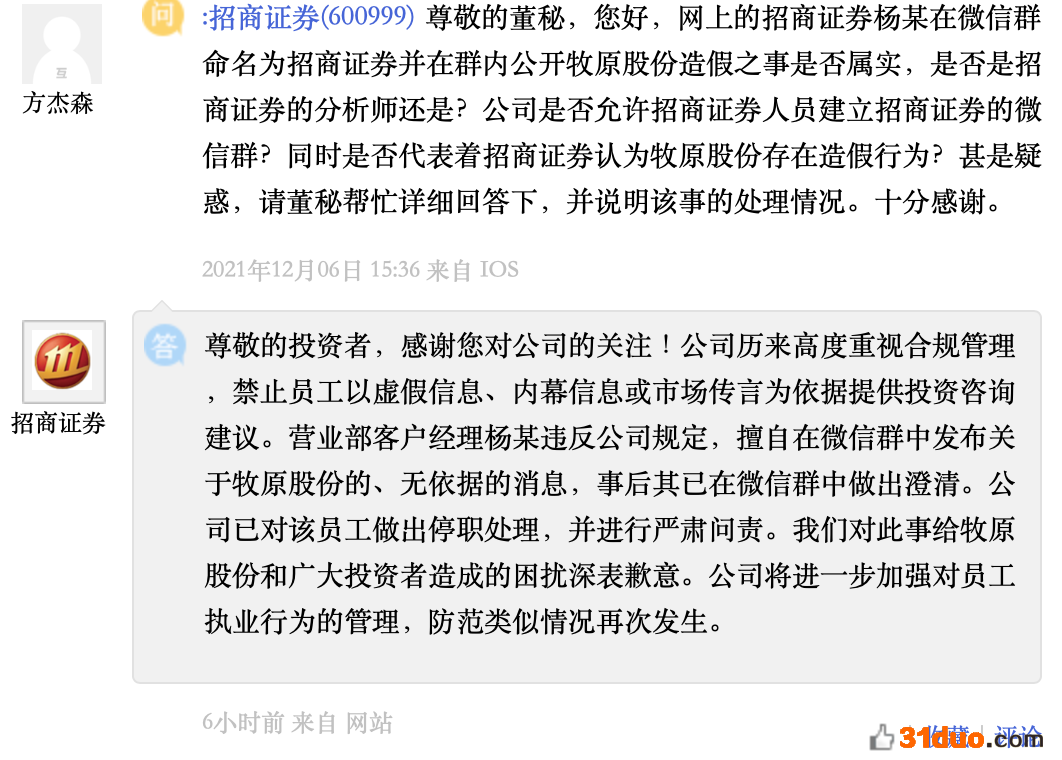 今日上午,招商证券在上证e互动平台就客户经理杨某在微信群内发布牧原股份涉嫌财务造假之事进行了回应,并表示:公司已对该员工做出停职处理,并进行严肃问责。