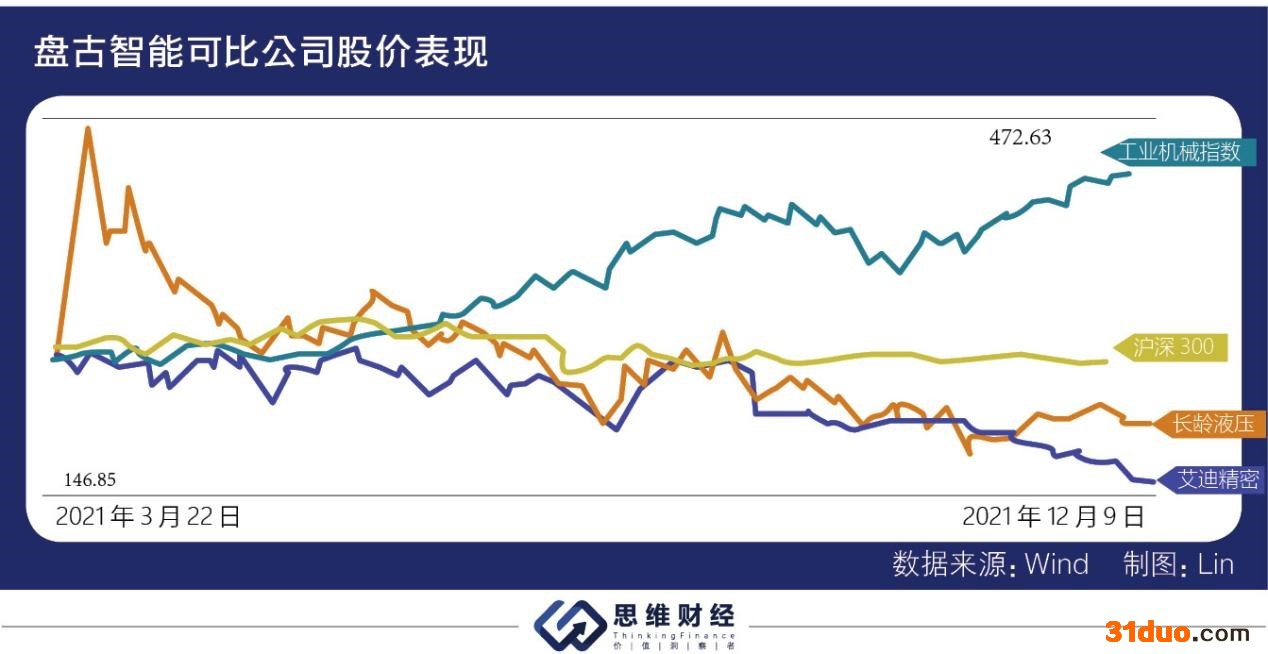 在未来行业增长放缓背景下,盘古智能现有的体量与可比公司存在较大差距。招股书中,盘古智能将艾迪精密(603638.SH)、长龄液压(605389.SH)作为可比公司,这是由于国内尚没有与发行人产品完全相同的上市公司。
