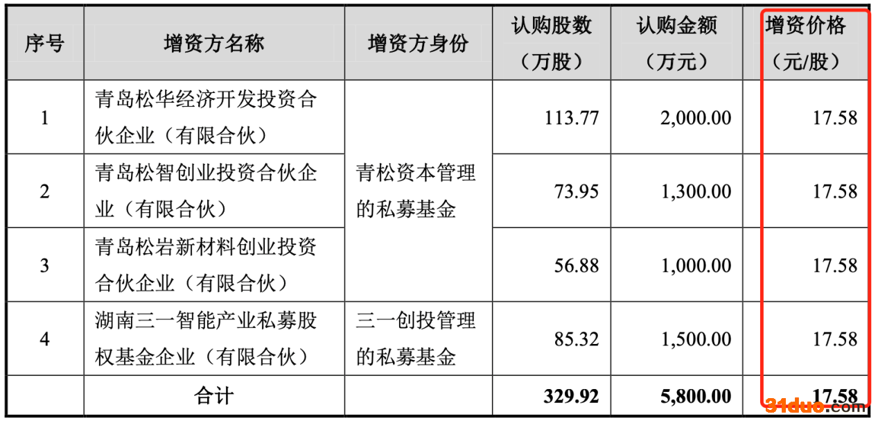 2020年12月18日,盘古智能召开了2020年第三次临时股东大会,审议通过《关于增资扩股的议案》,由青岛松华经济开发投资合伙企业(有限合伙)、青岛松智创业投资合伙企业(有限合伙)、青岛松岩新材料创业投资合伙企业(有限合伙)、湖南三一智能产业私募股权基金企业(有限合伙)等外部投资方以17.58元/股认购329.92万股,认购资金总额5,800.00万元,其中329.92万元计入股本,5,470.08万元计入资本公积,增资明细如下: