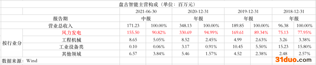 从营收结构来看,风力发电是公司近些年来最主要的收入来源。2018年至2021年上半年,这部分收入占营收总额分别为:78%、89%、95%、91%。