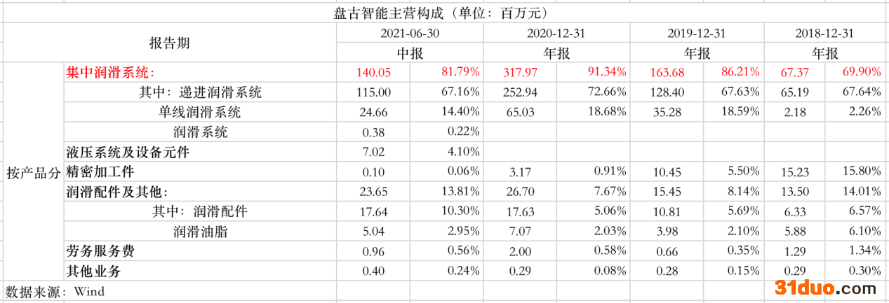 从产品结构来看,其集中润滑系统是公司的主力产品。2018年至2021年上半年分别贡献了6800万元、1.6亿元、3.2亿元、1.4亿元的营收;分别占比69.9%、86%、91%、82%。