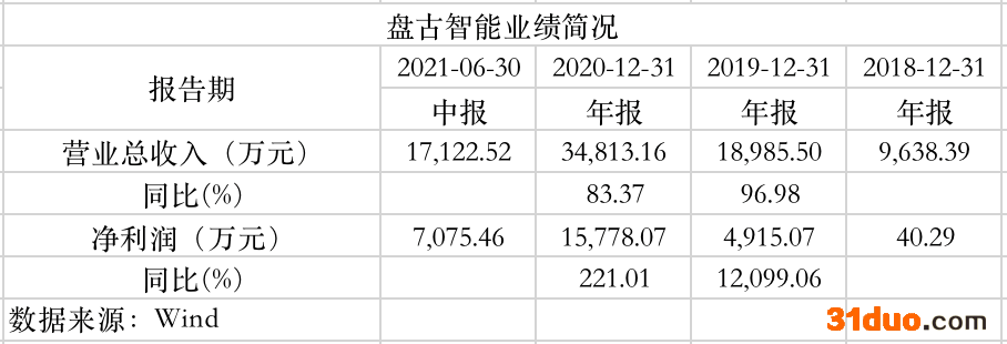 这家在2018年净利润仅有40.29万元的公司,到2019年底业绩爆长12倍,当年净利润达到了4900万元;到2020年底,盘古智能的净利润已经高达1.6亿元,同比依然大涨两倍之多。