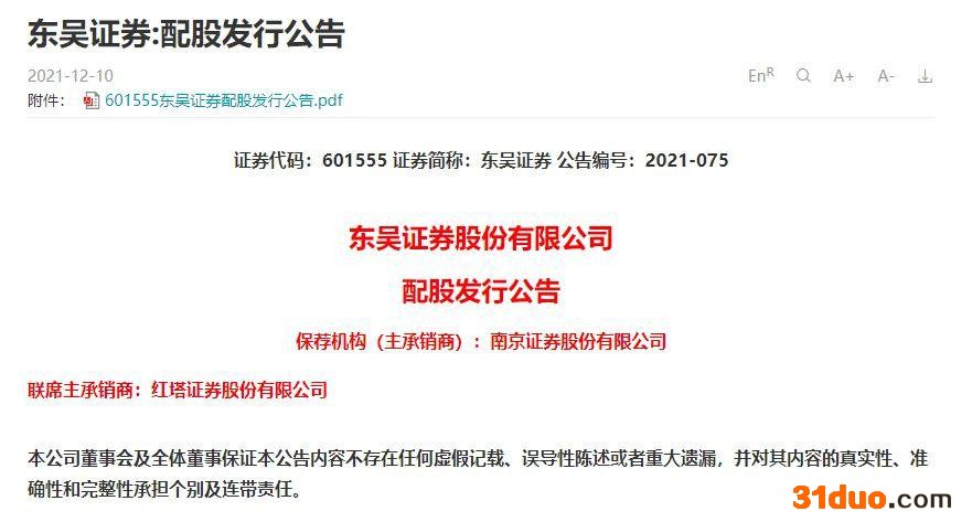 12月9日晚间,东吴证券公告,拟向全体股东进行10配3的配股,配股融资不超85亿元。配股价为7.19元/股,东吴证券最新12月9日收盘价为9.41元,配股价比最新股价低约24%。