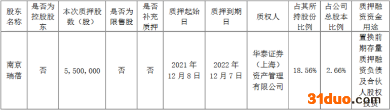 中国经济网北京12月10日讯 亿嘉和(603666.SH)昨日晚间发布公告称,公司于2021年12月8日收到持股5%以上股东南京瑞蓓创业投资管理中心(有限合伙)(以下简称“南京瑞蓓”)的函告,获悉其所持有的公司部分股份办理了质押。南京瑞蓓本次质押550.00万股,占其所持股份比例18.56%,占公司总股本比例2.66%,质押融资资金用途为置换前期存量质押融资负债及合伙人股权投资,质押起始日为2021年12月7日,质押到期日为2022年12月7日。