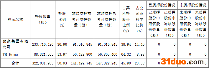 TB Home及其一致行动人合计持有顾家家居3.22亿股股票,占公司总股本的50.93%。本次股票质押后,累计质押股票1.48亿股,占TB Home及其一致行动人共同持有公司股数的45.90%,占公司总股本的23.38%。