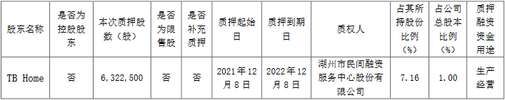 中国经济网北京12月10日讯 顾家家居(603816.SH)昨日晚间发布公告称,公司于昨日收到大股东TB Home Limited(以下简称“TB Home”)通知,TB Home将其持有公司部分股票进行了股票质押,本次质押632.25万股,占其所持股份比例7.16%,占公司总股本比例1.00%,质押融资资金用途为生产经营,质押起始日为2021年12月8日,质押到期日为2022年12月8日。