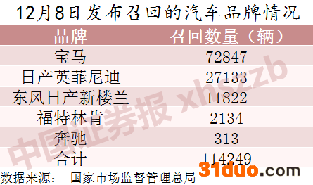 国家市场监督管理总局官网最新消息显示,12月8日,共有宝马、日产英菲尼迪、东风日产、林肯、奔驰等五个品牌的车企,宣布了最新一次的汽车召回公告,总计涉及拟召回车辆114249辆。
