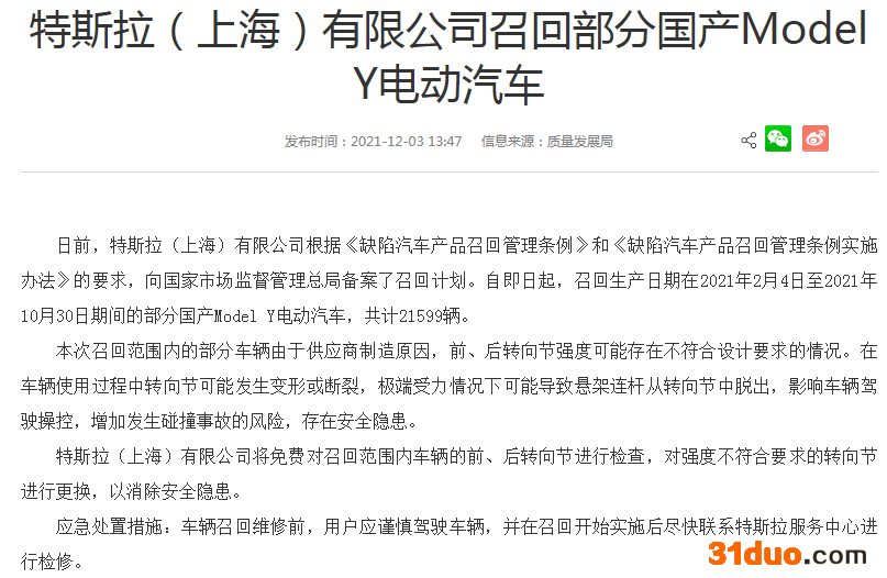 此前的12月3日,国家市场监督管理总局官网消息称,特斯拉备案了最新一次召回计划,自当日起召回生产日期在2021年2月4日至10月30日期间的部分国产Model Y电动汽车,共计21599辆。
