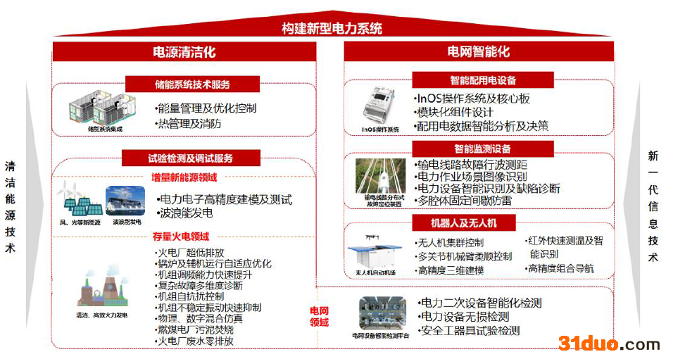 南网科技以电源清洁化和电网智能化为主线发展主营产品,逐步发展出技术服务和智能设备的两大业务体系,主要提供“技术服务+智能设备”的综合解决方案。公司的技术产品应用于电力能源系统的电源侧(发电环节)、电网侧(输电环节、变电环节、配电环节)和用户侧(用户环节)相关环节。