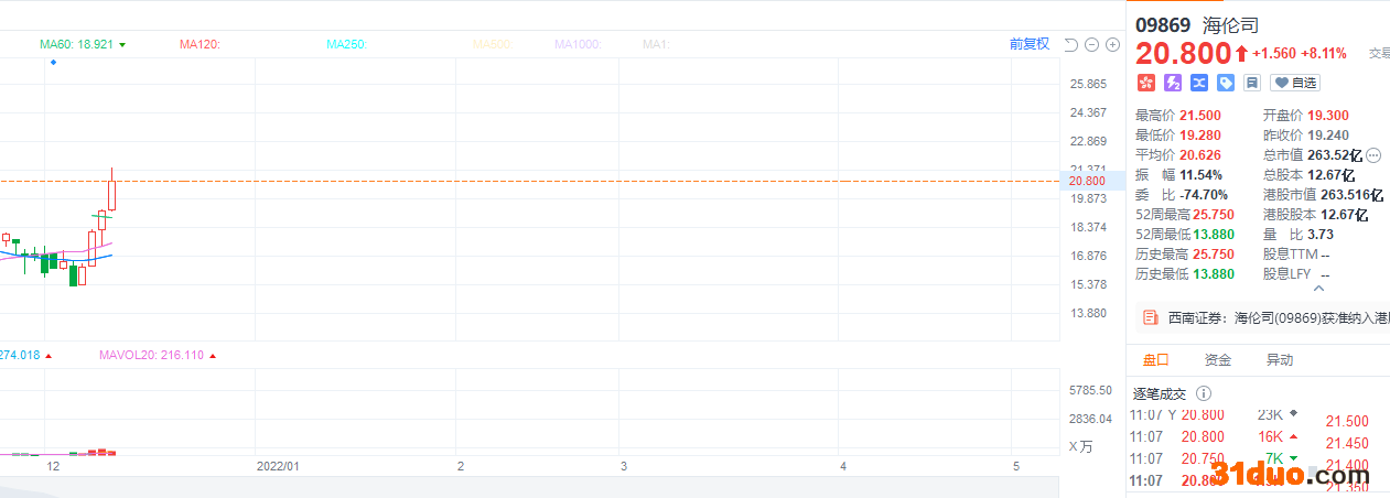 财联社(上海,编辑周新旸)讯,年轻人的小酒馆——海伦司(09869.HK)近四个交易日持续上涨,最新报价20.8港元,四个交易日累计涨幅超35%。直接刺激股价的一个利好就是海伦司获准被纳入恒生综合指数及港股通, 自本周一(12月6日)起生效。