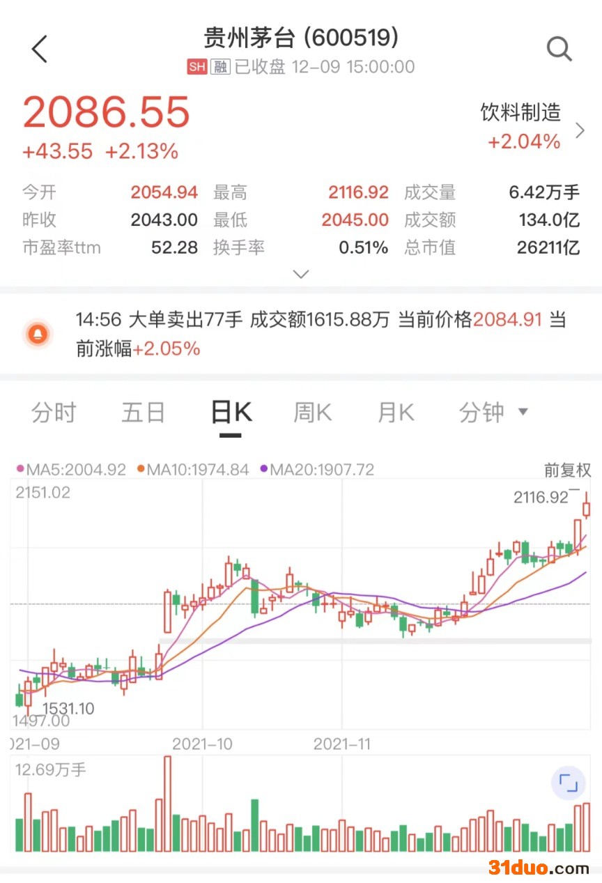 A股市值“一哥”贵州茅台上涨2.13%。本周以来,贵州茅台累计上涨5.82%。