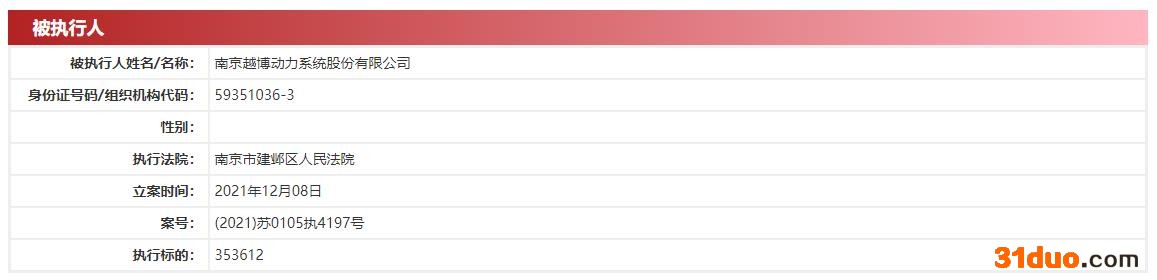 中国经济网北京12月10日讯 近日,执行信息公开网显示,南京越博动力系统股份有限公司(简称“越博动力”,300742.SZ)新增被执行