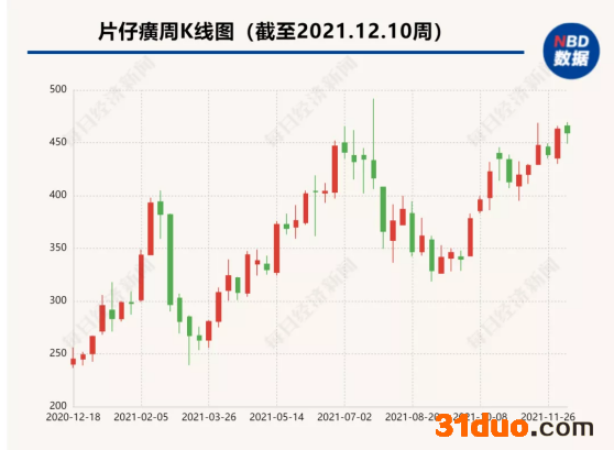 7月21日,片仔癀股价涨至491.88元/股创下历史新高,总市值一度超过3000亿元。