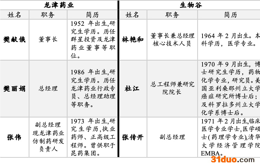 龙津药业、生物谷高层专业背景对比
