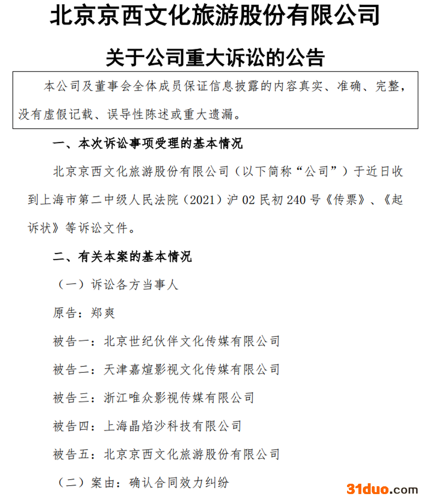 公告中显示,郑爽起诉的五被告分别为:北京世纪伙伴文化传媒有限公司(被告一)、天津嘉煊影视文化传媒有限公司(被告二)、浙江唯众影视传媒有限公司(被告三)、上海晶焰沙科技有限公司(被告四)、北京京西文化旅游股份有限公司(被告五)。