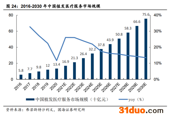 另一方面,随着90后和Z世代步入职场,生活压力和熬夜等不良习惯共同作用下,脱发人群数量直线上升,越来越多人对这个极度影响颜值的因素在意起来。咨询数据预测,中国植发医疗服务市场规模2030年有望达到756亿元,2020-2030年复合增长率为18.89%。