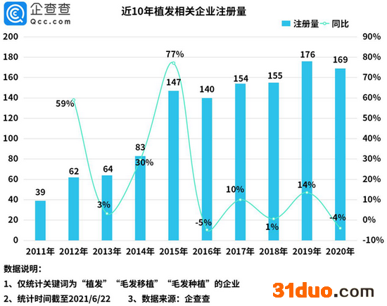 企查查数据显示,2020年共有169家植发相关企业注册,同比不升反降。融资战绩更是寥寥无几,民营医院中只有雍禾医疗于2017年完成了来自CPE源峰的战略融资,碧莲盛2018年拿下了华盖资本的5亿元战略融资以及大麦植发今年获得的森耀投资和上海诺伟其的股权融资。