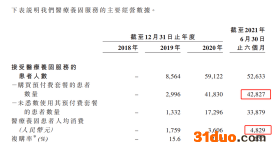 据其招股书披露,自2019年起,雍禾医疗便开始通过“店中店”模式在每家植发中心内部建立史云逊医学健发中心,针对各种头皮和毛发问题为患者提供非手术解决方案。仅2021年上半年就有近5.3万人接受养固服务,其中有近8成消费者预付套餐治疗费用,人均花费为4829元。