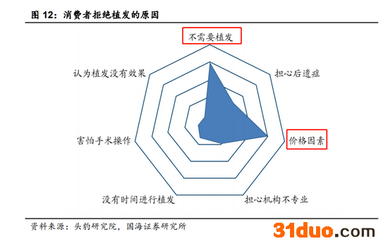 据雍禾医疗招股书披露,截至2021年上半年,共有2.95万人接受植发服务,平均支付价格为每人2.7万元。对于不少“人间蒲公英”而言,这个费用水平仍是高不可攀。头豹研究院的调研数据也显示,消费者拒绝植发的原因中,价格是决定性因素之一。