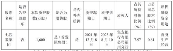 12月10日,厦门银行发布公告称,于日前收到股东七匹狼集团的通知,获悉该集团于近日将其所持有的该行1600万股股份进行了质押。而此前,该行已有超6000万股股份被该集团质押。