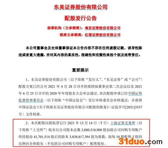 12月9日晚间,东吴证券发布公告称,经证监会核准,公司按每10股配3股的比例向全体股东(不包括公司回购专用账户)配售股份,可配股数量总计约为1,151,64.52万股。