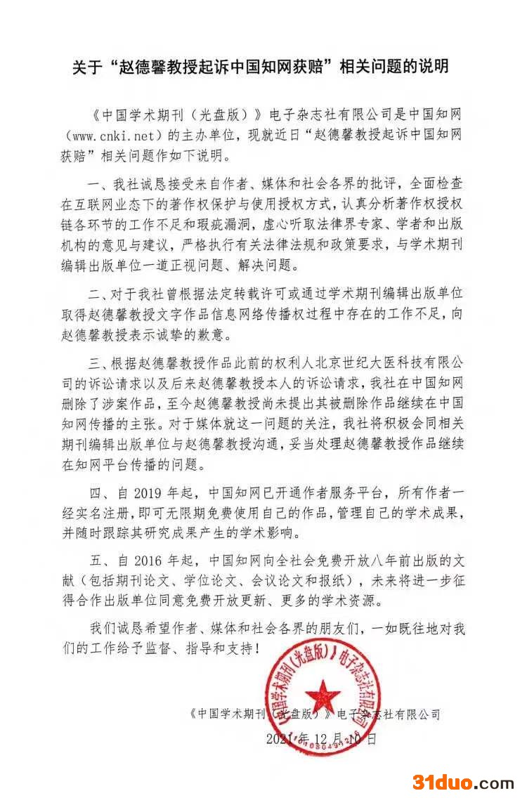 10日晚间,微信号“CNKI知网”发布《关于“赵德馨教授起诉中国知网获赔”相关问题的说明》(简称“说明”)。说明提到,《中国学术期刊(光盘版)》电子杂志社有限公司是中国知网的主办单位。该公司表示,诚恳接受来自作者、媒体和社会各界的批评,全面检查在互联网业态下的著作权保护与使用授权方式,认真分析著作权授权链各环节的工作不足和瑕疵漏洞,虚心听取法律界专家、学者和出版机构的意见与建议,严格执行有关法律法规和政策要求,与学术期刊编辑出版单位一道正视问题、解决问题。