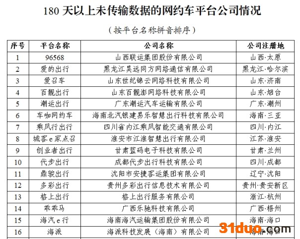 新增5家已累计180天未传输数据的网约车平台公司,包括四川省内江乘风智能交通有限公司(乘风行出行)、成都代步出行科技有限公司(代步出行)、贵州多彩出行信息技术有限公司(多彩出行)、贵州久网同城科技有限公司(黔程出行)、广州如约数据科技有限公司(如约的士)。值得注意的是,在订单量超过30万单的网约车平台中,伴个桔子9月、10月、11月持续三个月订单合规率均排名倒数第一。