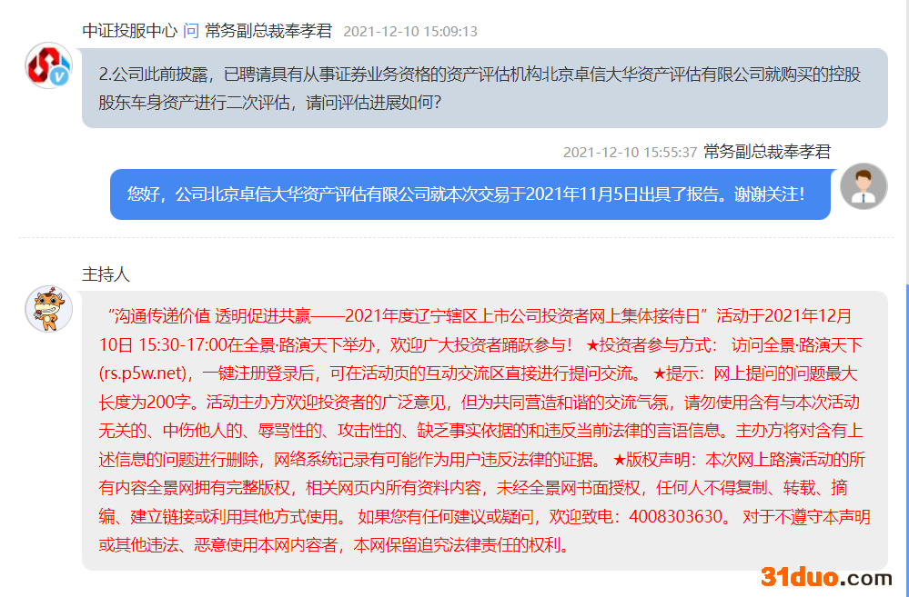 12月10日下午3时至5时,由辽宁证监局联合辽宁上市公司协会、全景网络共同举办的2021年度辽宁辖区上市公司投资者网上集体接待日活动在线上举行,活动刚一开始,代表曙光股份参与交流的公司常务副总裁奉孝君就收到了投服中心的连连追问。对此,奉孝君回复称,如公司董事会决议同意将此交易提交股东大会审议,公司将按股东大会的决定执行后续安排。北京卓信大华资产评估有限公司就本次交易于2021年11月5日出具了报告。