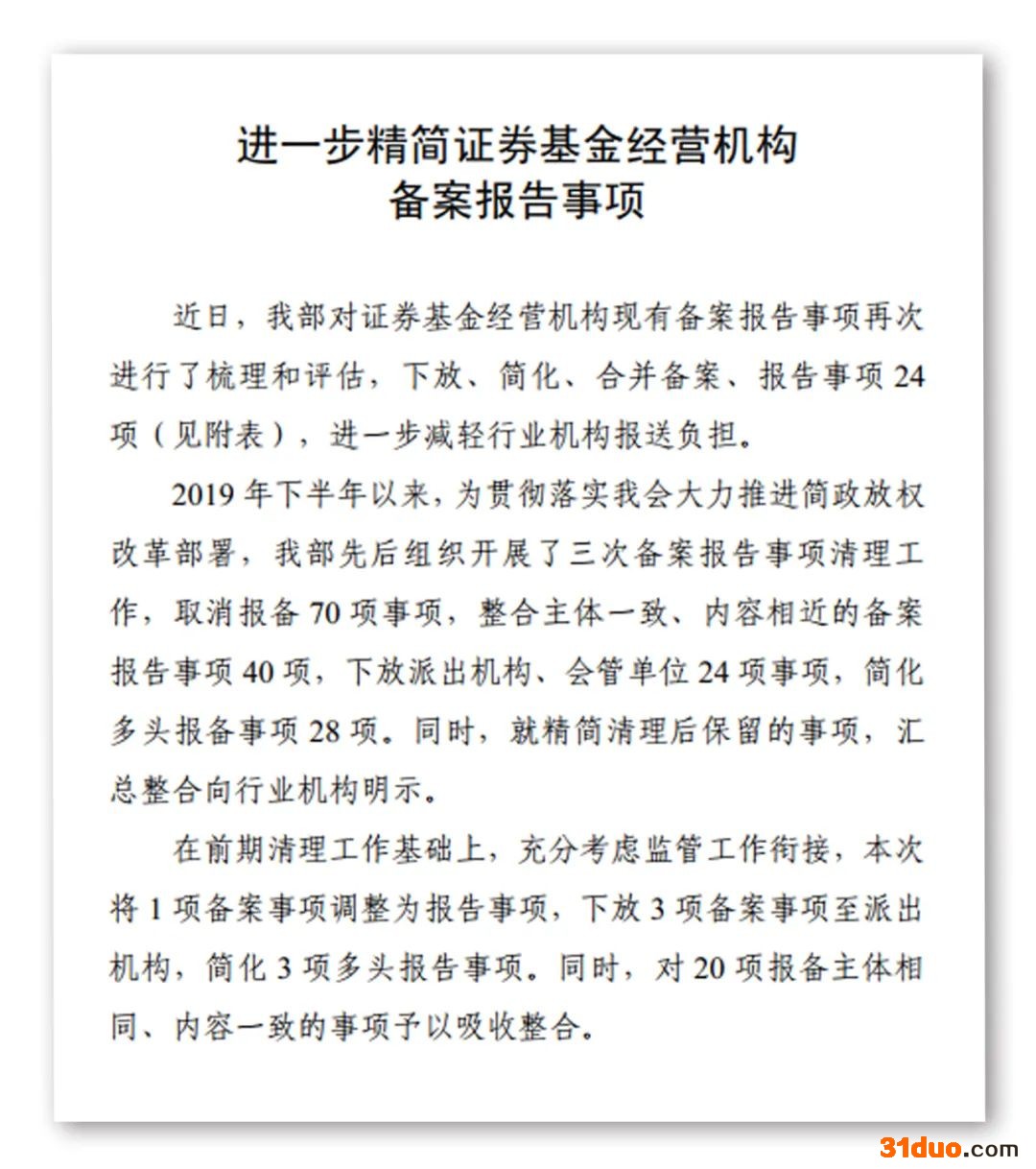 12月9日,证监会证券基金机构监管部最新一期《机构监管情况通报》指出,进一步精简证券基金经营机构备案报告事项,下放、简化、