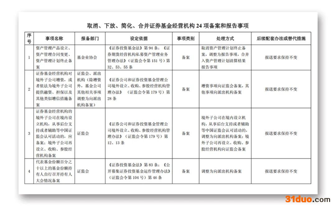 12月9日,证监会证券基金机构监管部最新一期《机构监管情况通报》指出,进一步精简证券基金经营机构备案报告事项,下放、简化、合并备案、报告事项24项。其中,包括取消资产管理计划终止备案、合并资产管理计划重大事项报告等重要调整。
