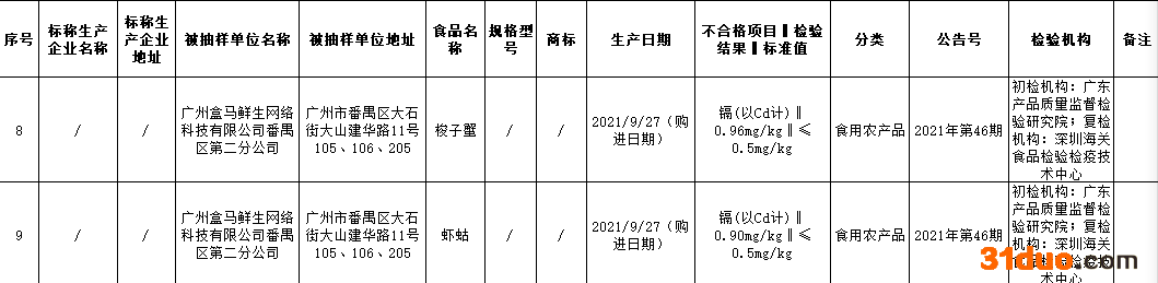 本次抽检发现,广州盒马鲜生网络科技有限公司番禺区第二分公司售卖的食用农产品梭子蟹、虾蛄镉(以Cd计)含量均不合格,购进日期均为2021年9月27日,其中,梭子蟹检验结果为0.96mg/kg,虾蛄检验结果为0.90mg/kg,标准值均为≤0.5mg/kg,初检机均构为广东产品质量监督检验研究院;复检机构均为深圳海关食品检验检疫技术中心。