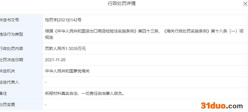 萝岗海关行政处罚案件公示信息(检罚字(2021)0142号)显示,高露洁棕榄(中国)有限公司擅自使用违规进口鼠尾油被立案,萝岗海关依据《中华人民共和国海关行政处罚实施条例》第三十三条之规定,对其罚款人民币1.3039万元,处罚日期为2021年11月26日。