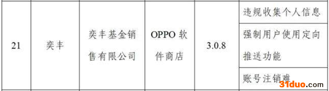 据通报内容,在OPPO软件商店,奕丰APP被指存在违规收集个人信息、强制用户使用定向推送功能、账号注销难等侵权问题。