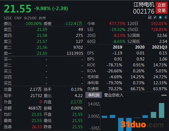 股价方面,江特电机因一年涨10倍成为锂电大牛股。据统计,江特电机的股价不仅在9月14日创下历史新高达32.56元/股,而且在2020年12月4日至2021年9月17日期间,累计涨幅达1003.25%。