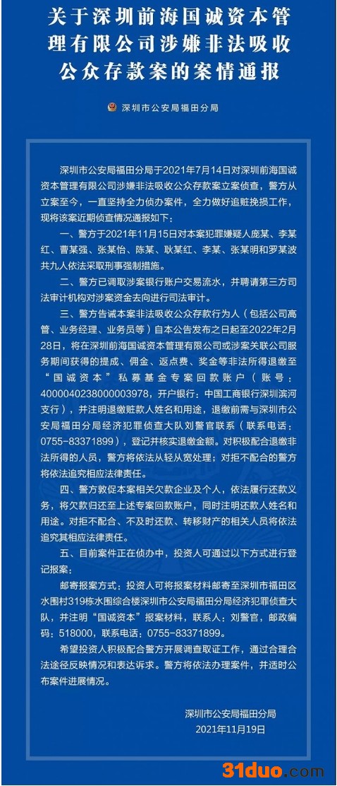 事实上,早在11月19日,前海国诚资本就已经被深圳市公安局福田分局通报了其涉嫌非法吸收公众存款案最新进展。