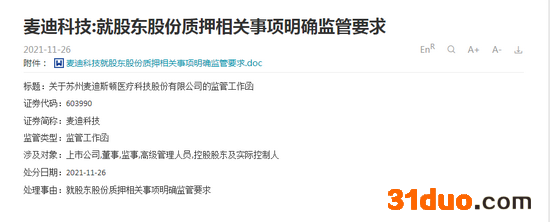 关于控股股东为何质押股权,麦迪科技官方给出的答案是,质押融资资金用于偿还债务。而公司也由于股东大比例质押股权于11月26日收到上交所监管函,对股东股份质押相关事项进行明确监管要求。