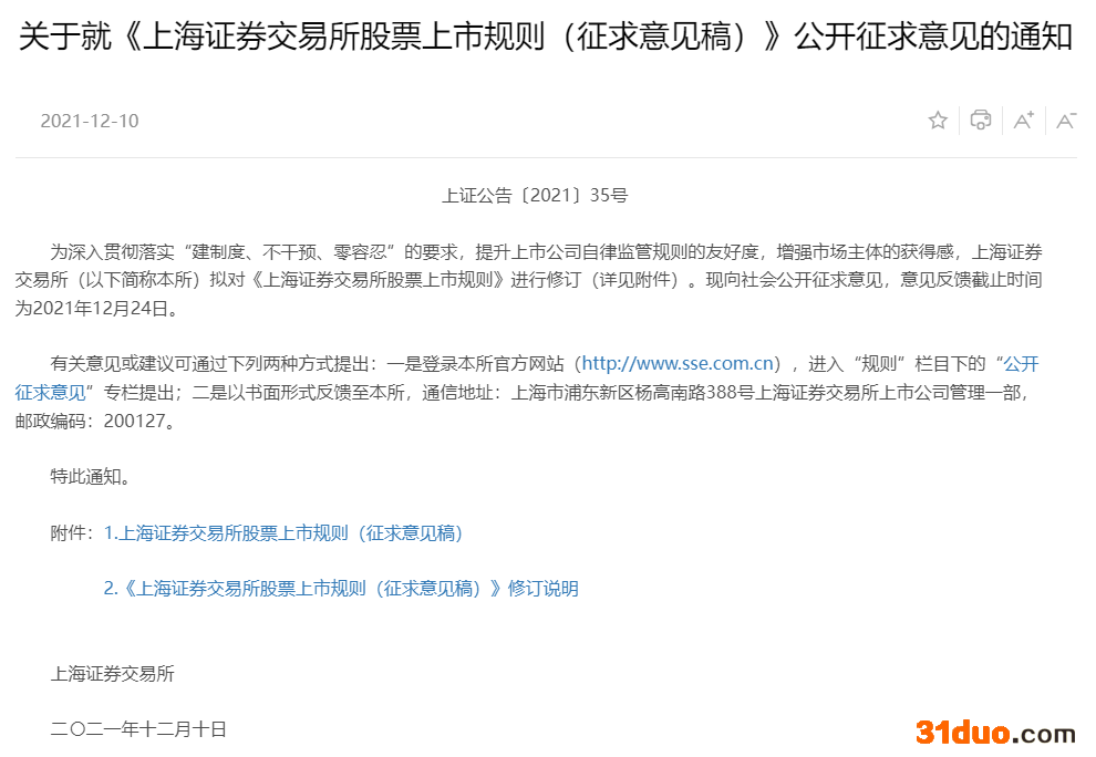 12月10日晚间,上交所就修订《上海证券交易所股票上市规则》(以下简称“股票上市规则”)公开征求意见。
