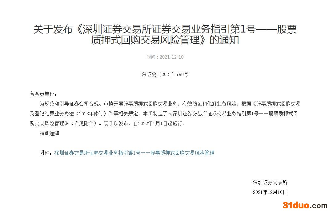 中新经纬12月10日电 深交所网站10日发布《深圳证券交易所证券交易业务指引第1号——股票质押式回购交易风险管理》的通知,提出按