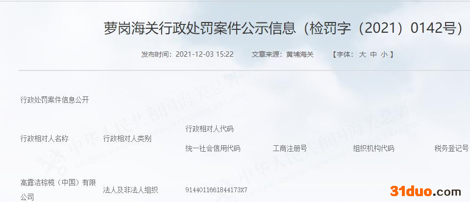 萝岗海关行政处罚案件公示信息(检罚字(2021)0142号)显示,高露洁棕榄(中国)有限公司擅自使用违规进口鼠尾油被立案,萝岗海关依据《中华人民共和国海关行政处罚实施条例》第三十三条之规定,对其罚款人民币1.3039万元,处罚日期为2021年11月26日。